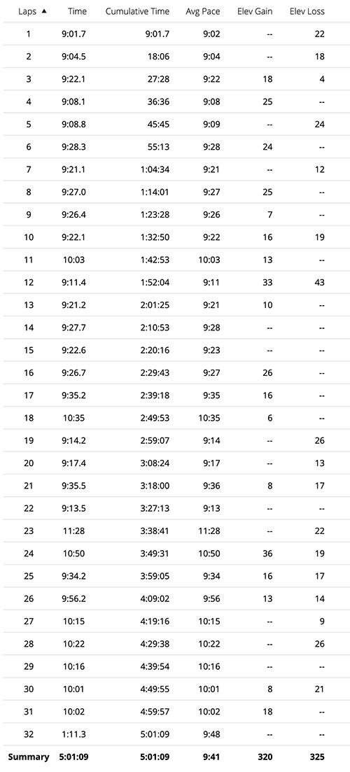 Glancing at my Garmin, I was surprised to note my finish time was much better than expected given all that had transpired. As I’d later discover, I’d finished just outside the upper quartile of 50K finishers, suggesting that aside from the Calum Neffs and Michael Wardians, many of my fellow ultrarunners had suffered right alongside me. Under normal circumstances and with my focus squarely on race day, I’d have set a goal of sub-5 hours. But this was not that day.