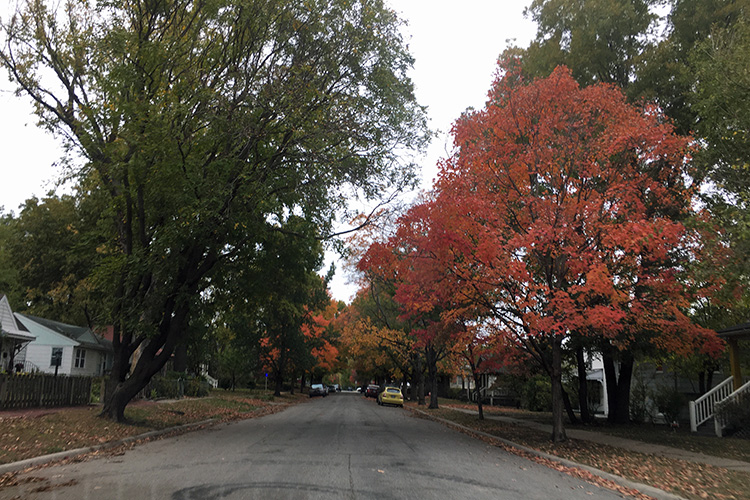 I was loving the wide, well-maintained streets, and soon we found ourselves in more rural surroundings reminiscent of the “in between” stretches of vast green countryside that separate points A and B on long road trips. Autumn had not yet run its course here—no surprise, with high temperatures hovering around 80°F during our visit—and many of the trees still flaunted their flamboyant fall wardrobes.
