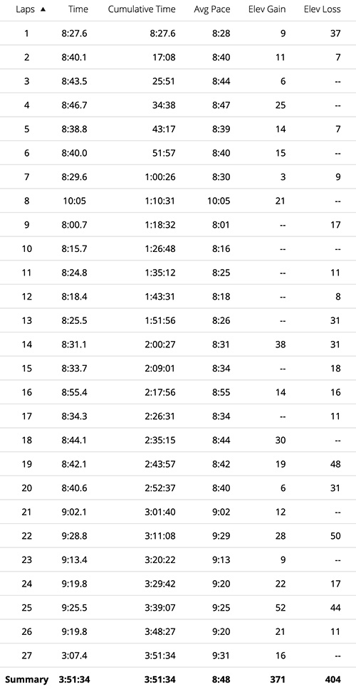 By the time we reached mile 28 on the out-and-back, the muscles in the lower back on my right side had tightened up significantly, and I needed another brief walk break to gather myself and quiet the discomfort in my back.