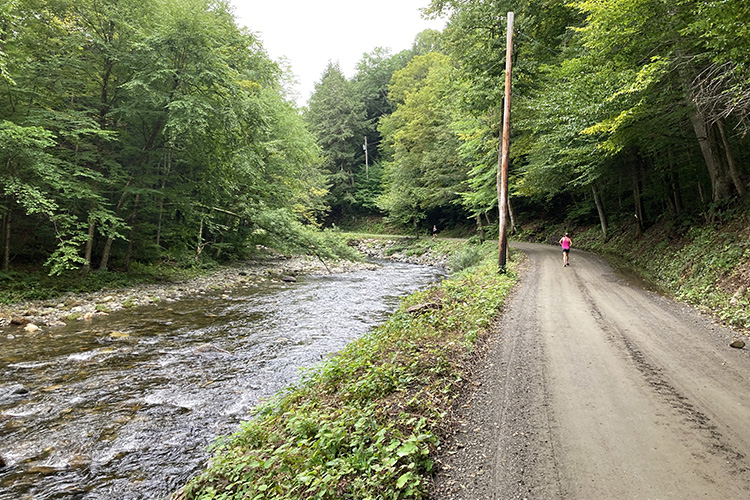 Approaching the end of this out-and-back section, we passed the first (and only 50K-specific) food station. I don’t recall what they were serving, but subsequent food stations (five in all) would offer Honey Stinger waffles, applesauce, and UnTapped gels made with maple syrup, none of which my stomach found remotely appealing.