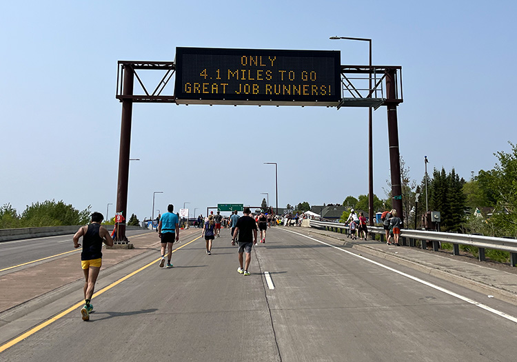 Along this stretch, small motivational signs appeared regularly with inspirational messages like “FUTURE SELF WILL THANK YOU FOR WHAT YOU’RE DOING TODAY” and, for the moms among us, “YOU GAVE BIRTH TO A HUMAN, YOU CAN DO THIS.” My pace had started to slip and I dug deep, determined to give as much as I could for as long as I could.