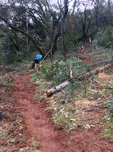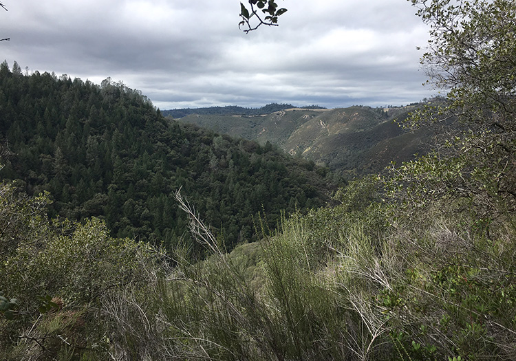 Approaching the end of this out-and-back section, we passed the first (and only 50K-specific) food station. I don’t recall what they were serving, but subsequent food stations (five in all) would offer Honey Stinger waffles, applesauce, and UnTapped gels made with maple syrup, none of which my stomach found remotely appealing.