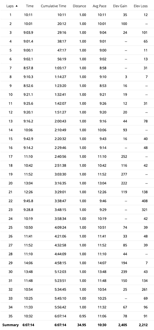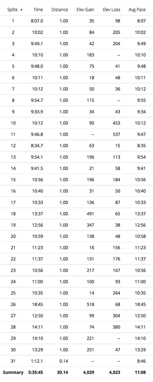 Glancing at my Garmin, I was surprised to note my finish time was much better than expected given all that had transpired. As I’d later discover, I’d finished just outside the upper quartile of 50K finishers, suggesting that aside from the Calum Neffs and Michael Wardians, many of my fellow ultrarunners had suffered right alongside me. Under normal circumstances and with my focus squarely on race day, I’d have set a goal of sub-5 hours. But this was not that day.