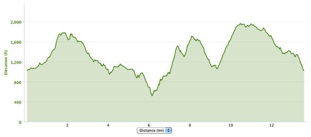 Cresting the first ¼-mile ascent, the road immediately turned back downhill as it would several more times over the next six miles. To be fair, what this course taketh it would also giveth back – for each ascent conquered, runners could look forward to a corresponding descent, and my Garmin actually calculated a net loss of ~50 feet over the course of 13.1 miles.