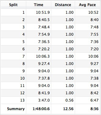 I’d glanced at the course map the day before and noted the route’s Jekyll & Hyde nature: hilly in the first half, Kansas-flat in the second. But seeing hills on a map is one thing – knowing how they’ll affect your race is another. Barring extremes like a Pikes Peak, it’s tough to assess “hilly” until you’re feeling it in your quads and lungs.