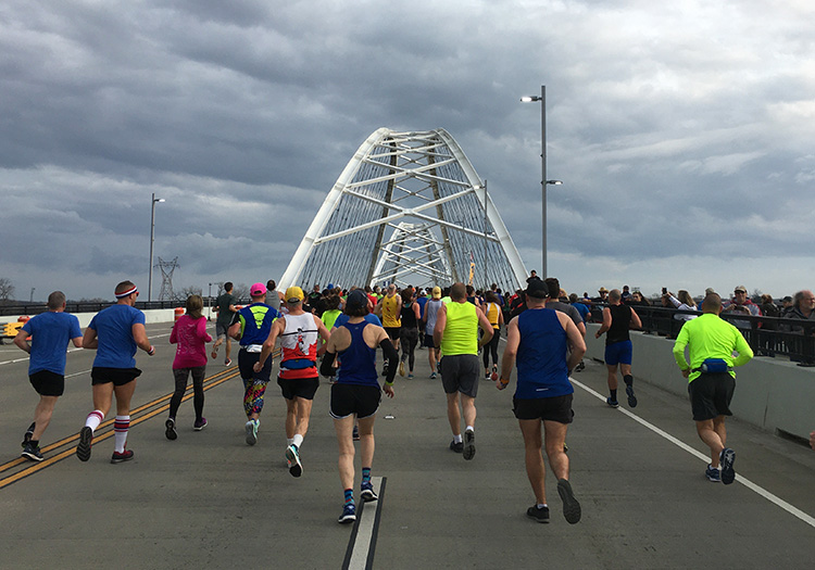Glancing to my left, the spectators lining the wide roadbed felt comically far away. Exhilarating as this stretch was, it didn’t (understandably) boast the electrifying energy of Tower Bridge, one of the loudest and most raucous stretches on the London Marathon course. I did, however, prefer it to the crowded opening stretch across the Verrazano-Narrows Bridge at the NYC Marathon which, after hours of waiting for the start, had been a study in sheer adrenaline. (For what it’s worth, the Golden Gate Bridge crossing in mile 8 of the San Francisco Marathon may be my favorite bridge segment of any race, as it affords epic views of sunrise over Alcatraz and the SF Bay.)