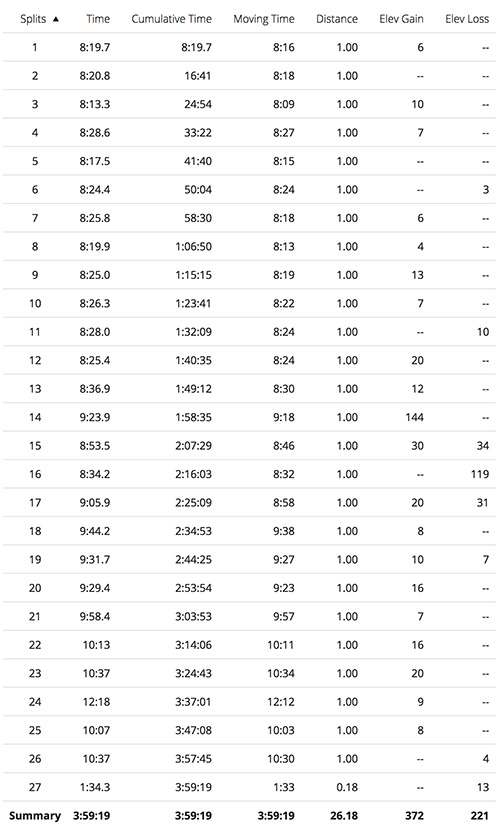 I came away from this race thinking four 50+ milers in 18 months was more than enough, and that maybe it was time to scale back a bit. Sure, conventional ultrarunning wisdom dictates that I take the next step up to 100K or even 100 miles, but I have no desire â I know I could persevere through 100 miles, but whatâs the point? Iâd much rather speed up again than slow down further, because I still believe itâs more difficult to run a fast marathon than a slow 100 miles. And I have no desire at this point to become an ultrahiker. I can see myself potentially stretching for 100K (and I have just the race in mind), but 100 miles ainât happening anytime soon. Though if Iâve learned one thing in my running career, itâs that I should never say never.