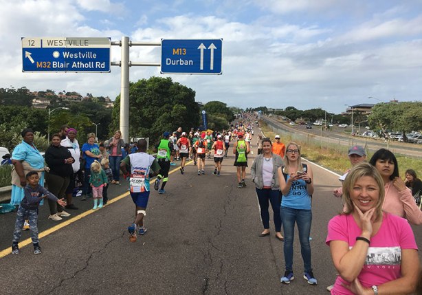 With around 7 km to go the concrete, steel and glass skyline of urban Durban came into view at last. The moment was empowering, to be running on a national highway lined with cheering supporters as the sprawling skyline of South Africa’s third largest city — and our final destination — beckoned in the distance. Welcome, the soaring gray skyscrapers seemed to say. We’ve been expecting you.