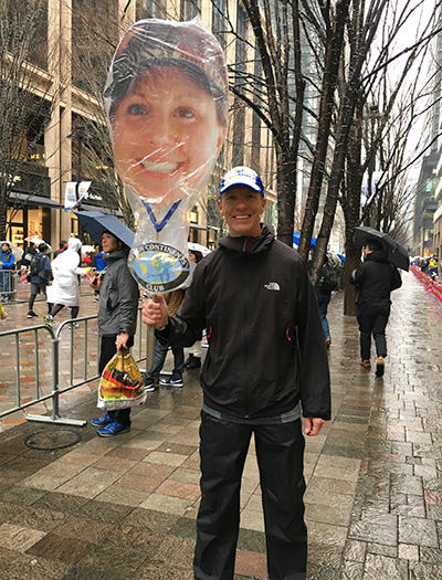 With that in mind, weâd created and brought with us to Tokyo a custom âCheerleader Louann on a stick,â i.e. an oversized cutout of her face, mounted on a wooden rod and adorned with its own blue ribbon and paper Seven Continents Club finisher medal. Like the trooper she is, Katie had carried Cheerleader Louann â wrapped in plastic to protect her from the rain â with her throughout the day, though unfortunately sheâd missed seeing the real Louann out on the course.