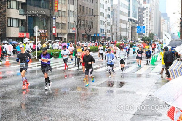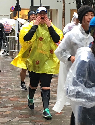 Walking a straight line from the International Forum to the course (a much shorter distance than the walk from the finish line), we arrived on Marunouchi Naka-Dori Ave and planted ourselves between the 41 km and 42 km markers. There we waited, scanning the oncoming crowd as we cheered and encouraged soggy runners. Some glanced over at us with dull eyes, their minds and bodies on the brink of exhaustion as hypothermia nipped at their heels. Arms pumped furiously, presumably trying to offset the loss of momentum in depleted legs.