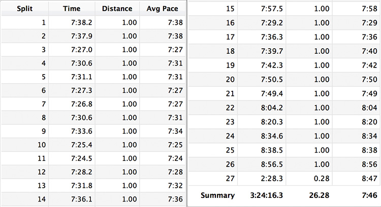 My tightest marathon splits to date: 1:42:00 for the first half, 1:42:14 for the second half