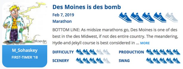 Overall, despite similar finisher numbers and less than half the urban population, Des Moines struck me as having more spectators than Kansas City. And the signage I saw along the course won the weekend as well. Sure, Iāve seen it before ā after 35 marathons and 40 half marathons, new spectator signs are tough to come by ā but āYouāre running better than the governmentā has taken on new meaning since 2016. And āToenails are for sissiesā is a tried-and-true sentiment that earns an unexpected smile when itās sponsored by the Des Moines University Foot & Ankle Clinic.