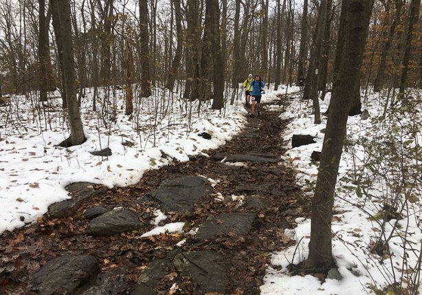 The JFK 50 course is part road (paved), part trail (unpaved). About 80% of the course runs on the unpaved Appalachian Trail and C&O Canal Towpath, with the paved 20% coming at the beginning and end. The course is divided into three main sections, starting with the Appalachian Trail (~11 of the first 16 miles) and moving on to the unpaved/crushed gravel C&O Canal Towpath (26 miles) before finishing on paved, rolling country roads (8 miles). The good news is you’ll get through the toughest section of the course (i.e. the Appalachian Trail) at the beginning; the bad news is that the hills and highly technical terrain will sap a lot of the energy and bounce from your legs. This was especially true in 2018, when record annual rainfall and eight inches of snow less than 36 hours earlier created trail conditions that were, according to one 31-time finisher, “the worst ever.” So my recommendation would be to prepare for the worst and then be pleasantly surprised if/when you luck into dry (or at least not marshy) trail conditions.