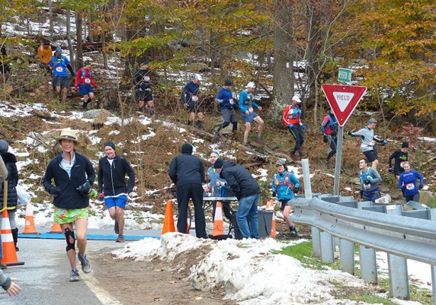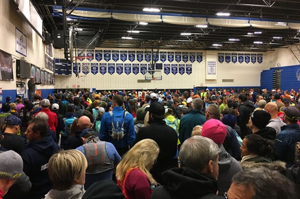 Race Director Mike (I presume, since I couldn’t hear his introduction) stepped up to the mic, welcomed us to the nation’s largest ultramarathon and confirmed that YES, the Appalachian Trail on which we’d run much of the first 16 miles would be a mess. And he applauded the race’s record number of female entrants, a commendable yet ironic fact given that I’d just been thinking on my walk into the gym how few women were in attendance. (Ultrarunning still has work to do before it can boast the equal or greater female representation of shorter distances.)