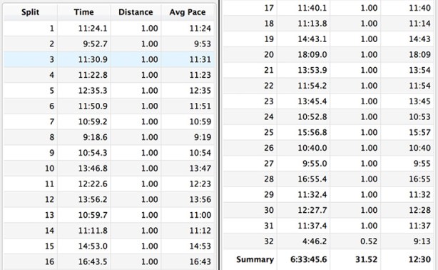 Finish time & pace: 6:33:45 (first time running the Harding Hustle 50K), 12:30/mile; average moving pace, 11:55/mile